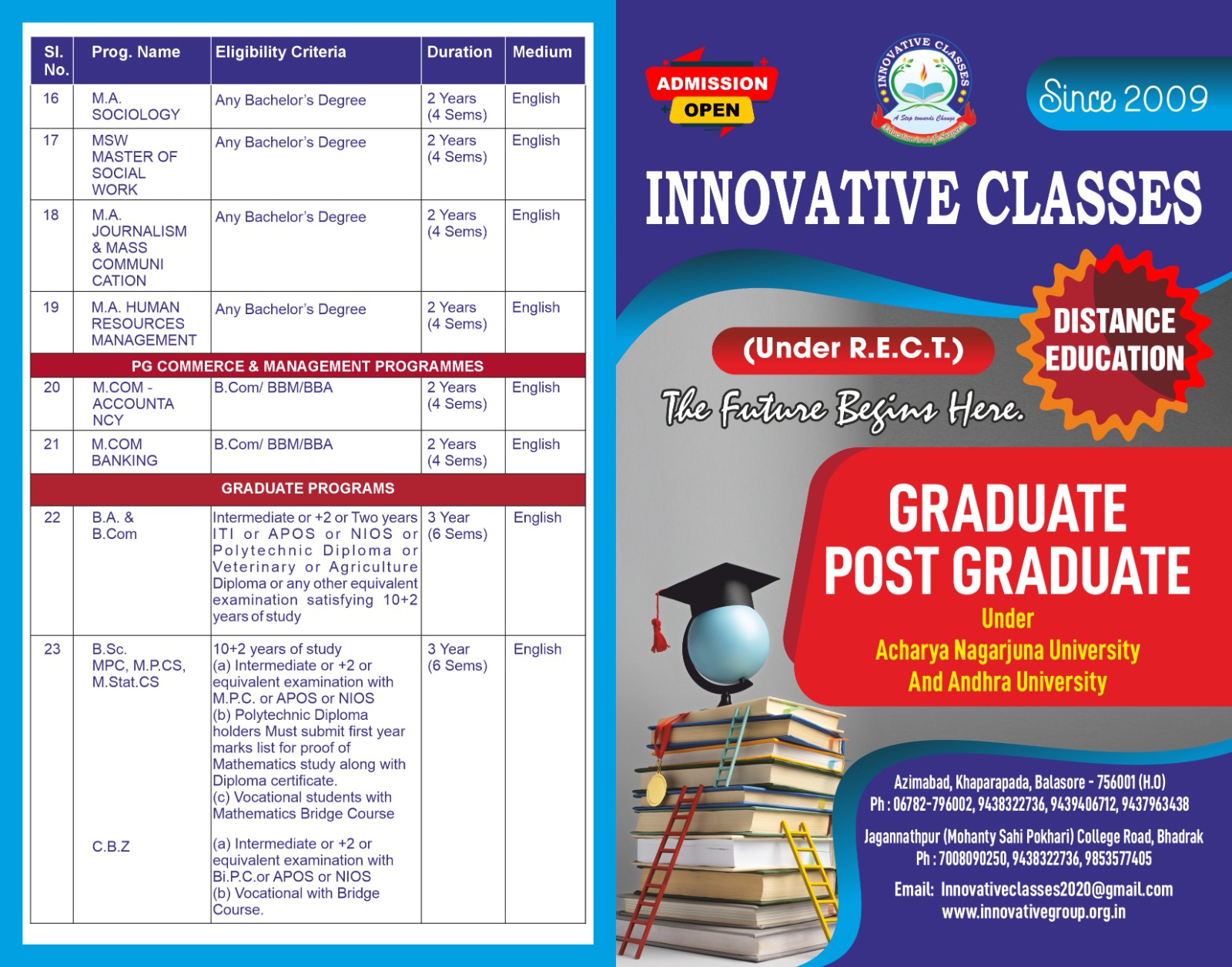 The admission process at Innovative Classes, Balasore is simple and transparent. Students can begin by collecting the admission form from our campus office or by applying online through our official website. After submitting the application form, candidates are required to provide their graduation mark sheets and certificates, along with a post-graduation certificate if they are applying for higher-level courses. Additional documents such as the college leaving or transfer certificate, Aadhaar or other valid ID proof, and recent passport-size photographs are also required. Once the documents are submitted, eligibility will be verified as per the respective university guidelines. Depending on the course, admissions may be based on merit or through an entrance test. After successful verification, students need to pay the admission or registration fee as per university norms. Upon confirmation, an official enrollment slip will be issued. Finally, students are invited to attend the orientation program, after which their classes commence at Innovative Classes.